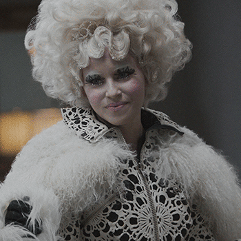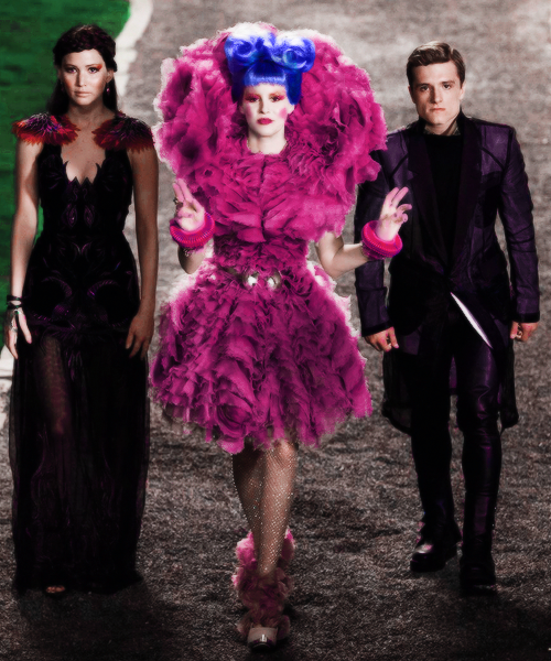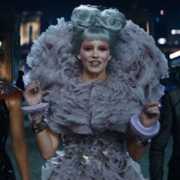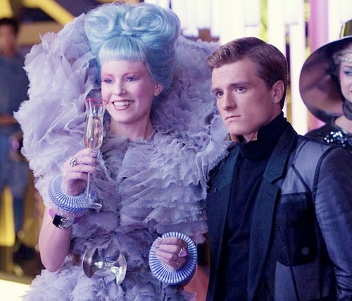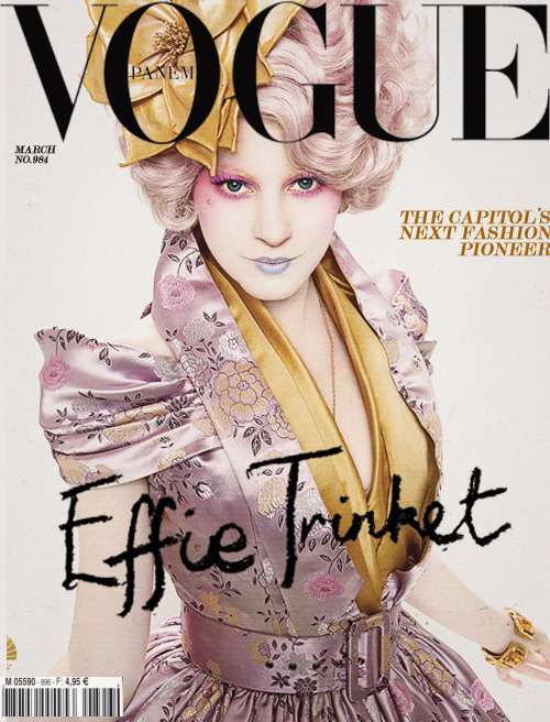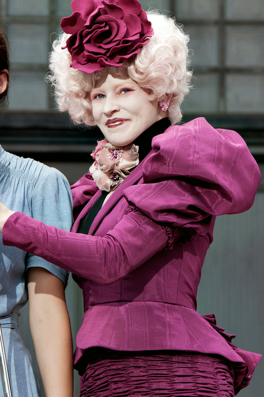 Effie Trinket's theatrical style perfectly represents the over-indulgent ruling class of Panem in The Hunger Games series. Click through to see every garish outfit she has worn. (Photos: Lionsgate; additional reporting by Giana Mucci)